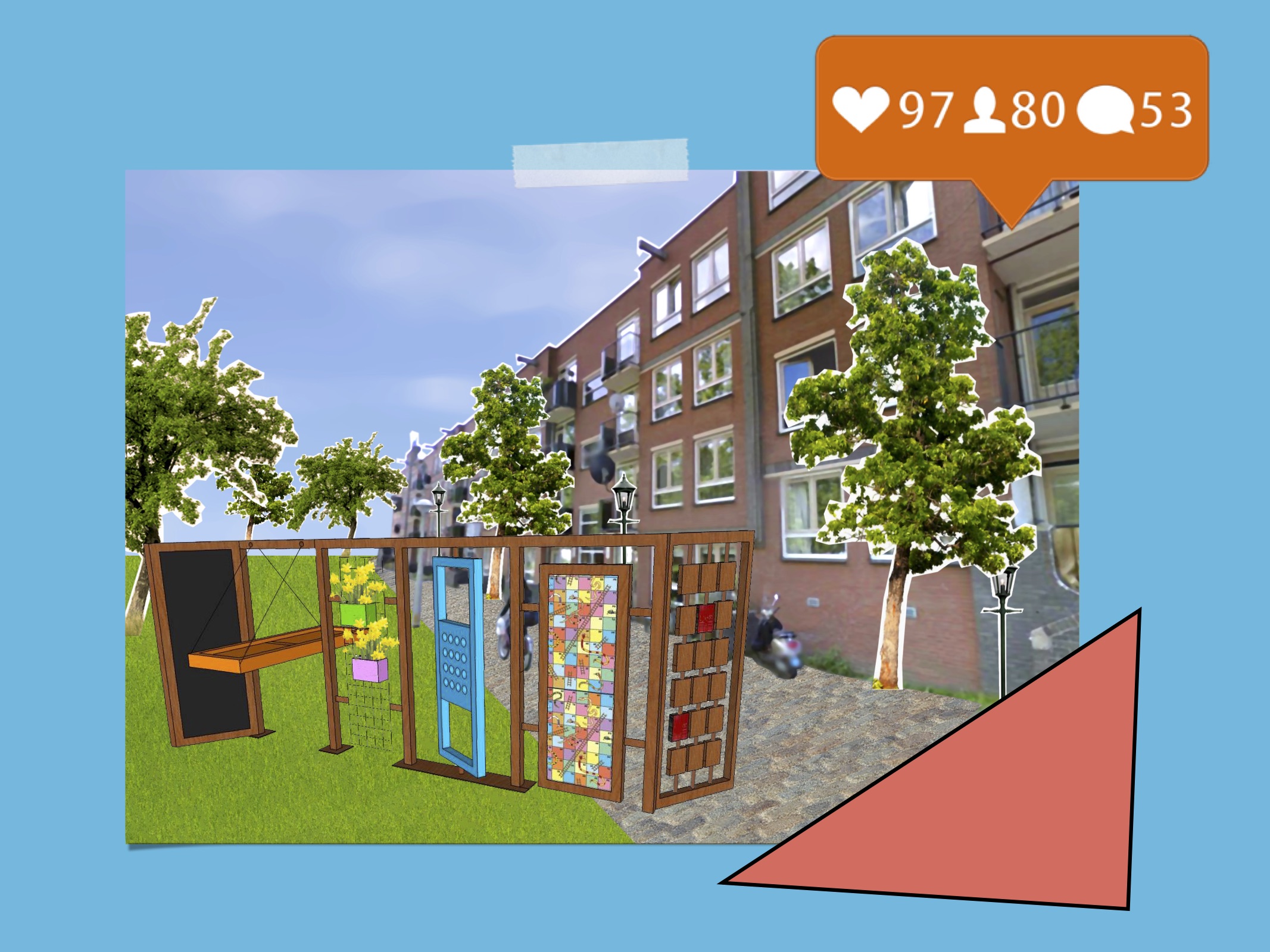De stoep vormt de perfecte ontmoetingsruimte. Op de stoep kom je iedereen tegen. Daarom is ons concept ook op straat. Om je buren te leren kennen is de voordeur een symbool van het begin van het contact. Als de deur openstaat voel je je welkom, ook al weet je nooit wat er zich achter een deur afspeelt. Daarom gaan we de deuren uit deze wijk als het middel gebruiken om met elkaar in contact te komen. Op de deuren worden spellen afgebeeld, die de mensen uit de buurt met elkaar kunnen spelen. Sommige deuren kun je kantelen of draaien, zo zie je nog niet gelijk wat er 'achter de deur' zit.